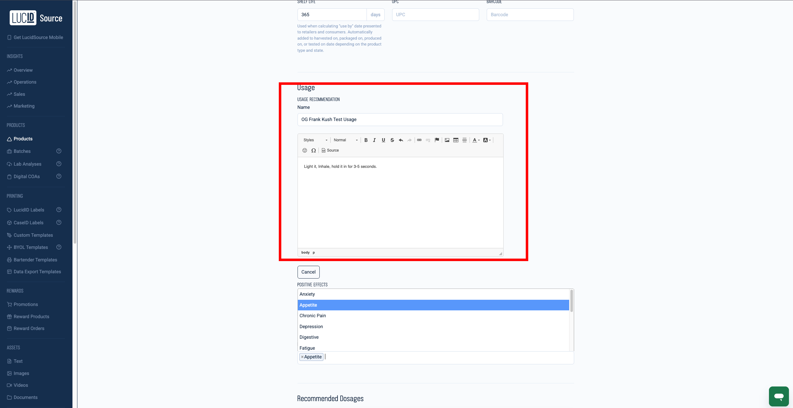 Name: Fill in the product name and then add the usage recommendation. For example, if the product is called “Lucid Pre-Roll”, the name here would be “Lucid Pre-Roll usage recommendation”.