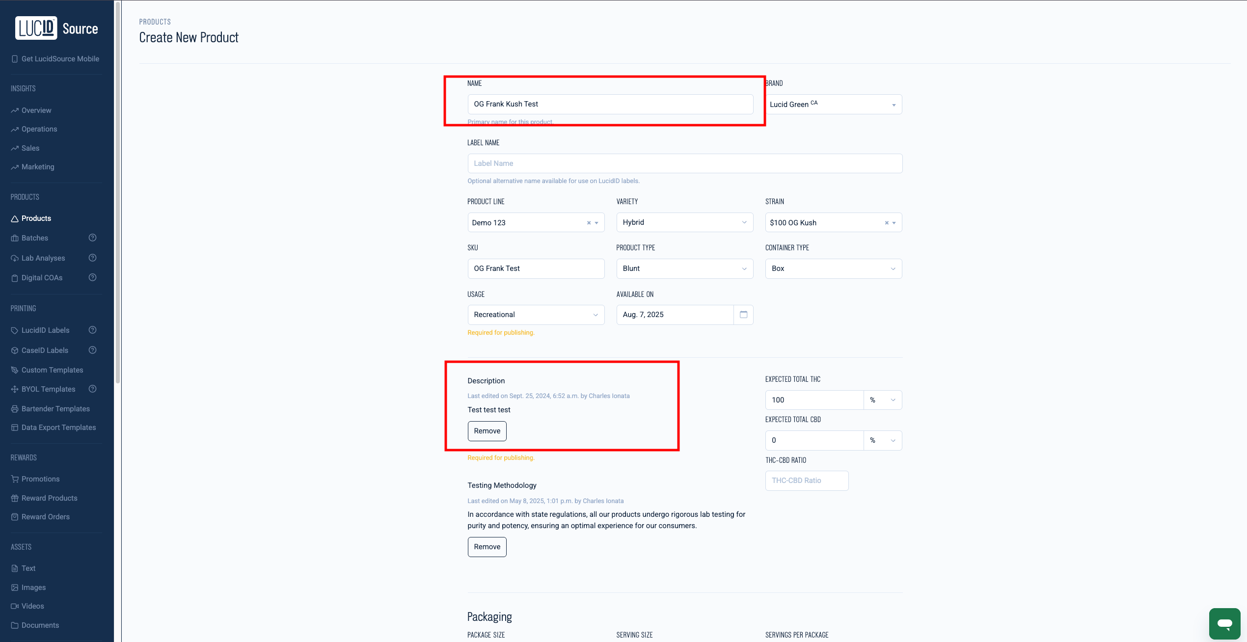 Name: Fill in the product name and then add description. For example, if the product is called “Lucid Pre-Roll”, the name here would be “Lucid Pre-Roll Description”.