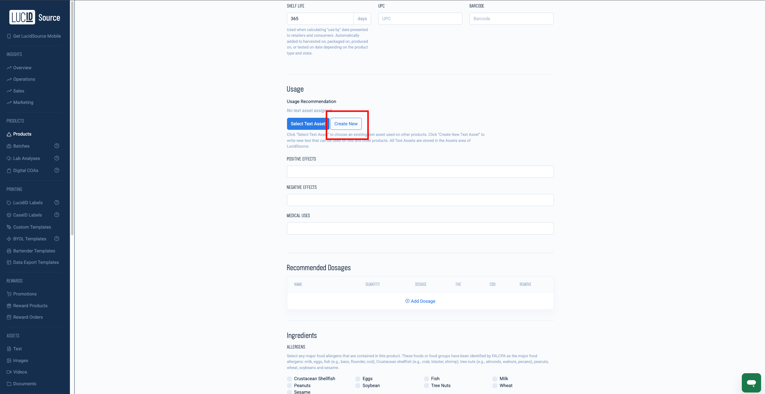 Ingredients: If you would like to add ingredients, select any major food allergens that are contained in this product. The ingredients can be specified by either selecting the items from the options below, or by creating a text asset below.