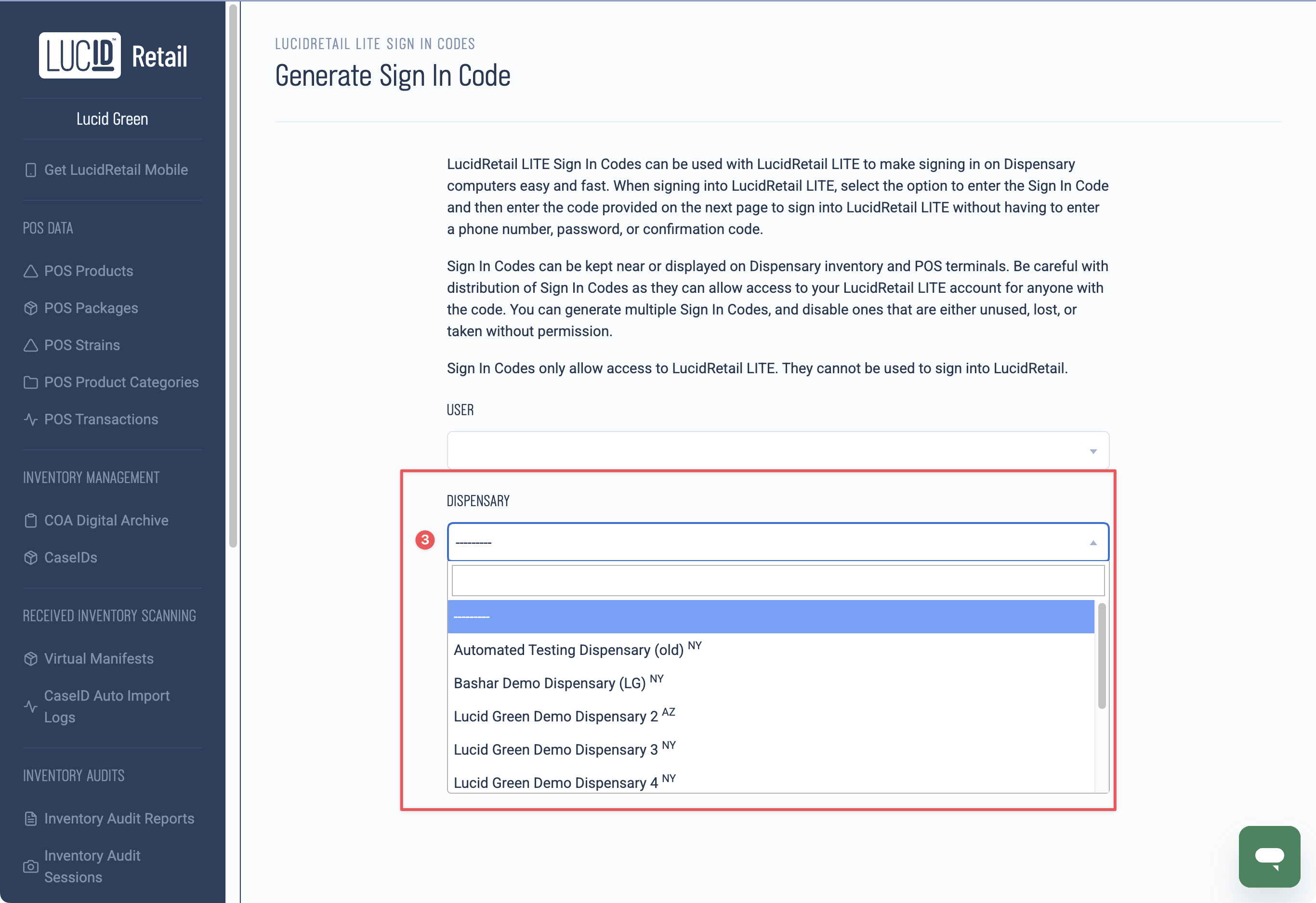 - Navigate to the "LucidRetail LITE Sign in Codes" menu on the left nav of LucidRetail: https://retail.lucidgreen.io/accounts/sign-in-codes/