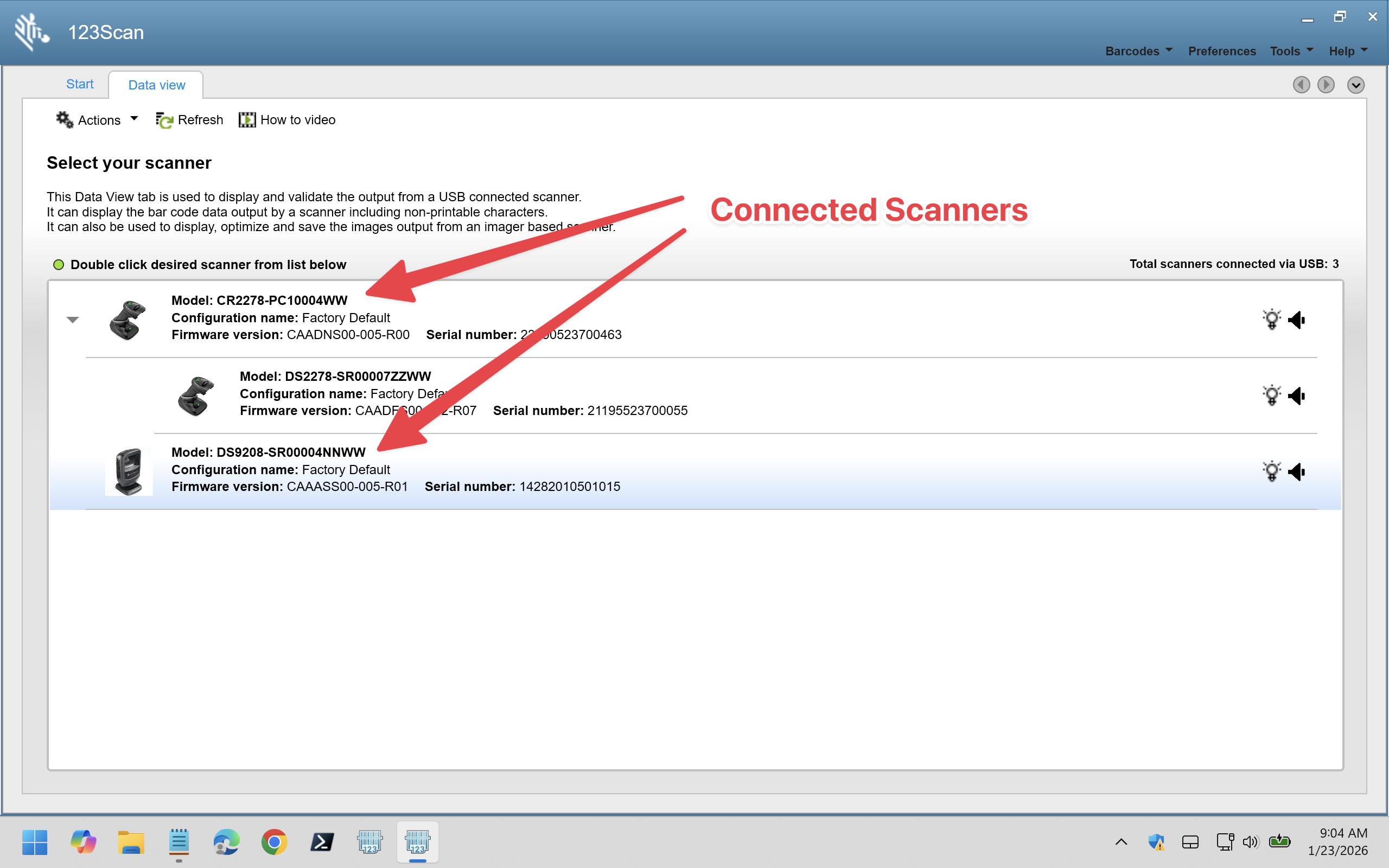 - Confirm that your scanner is showing up as connected. If your scanner is not showing up, follow support instructions from Zebra to connect your scanner.