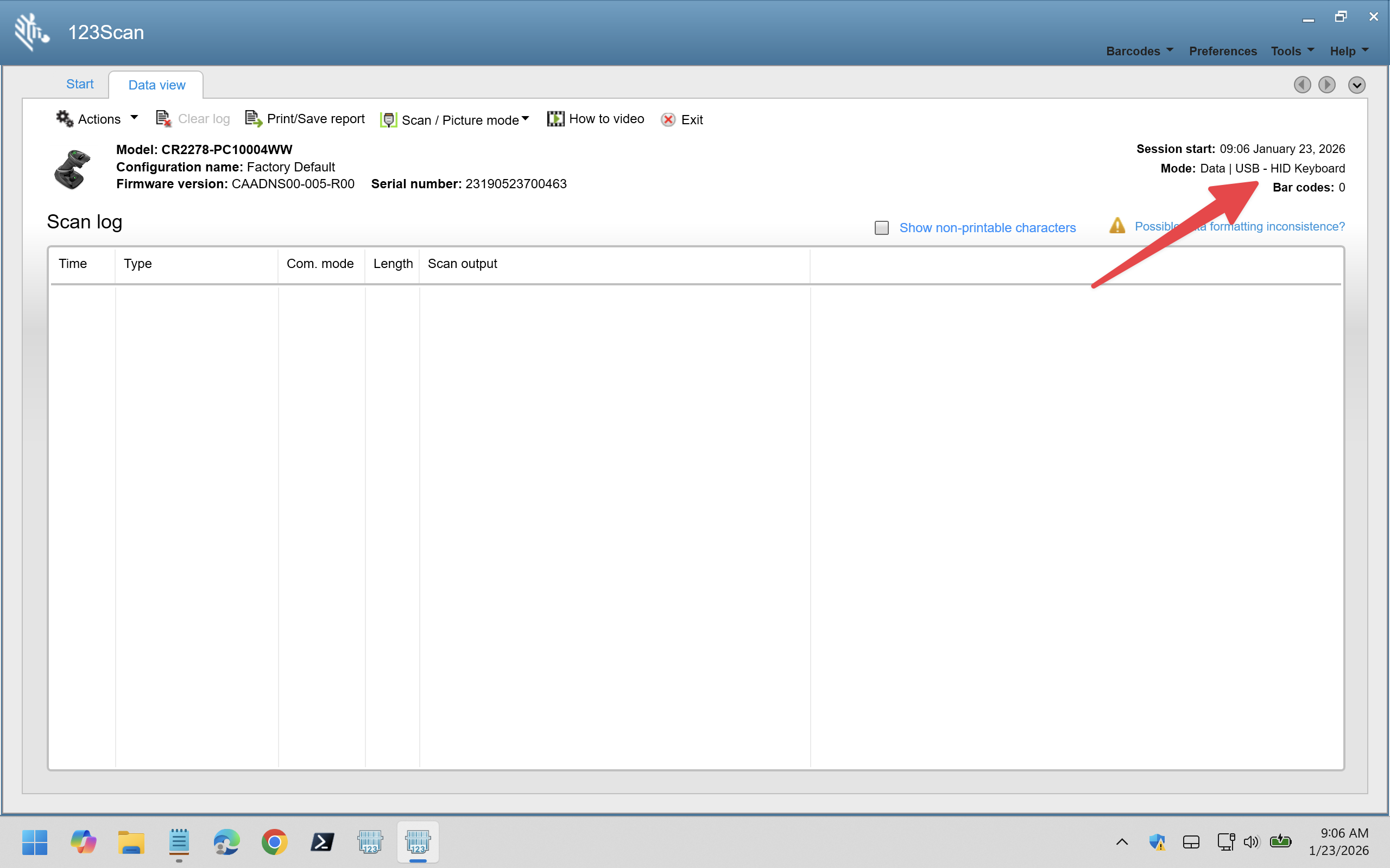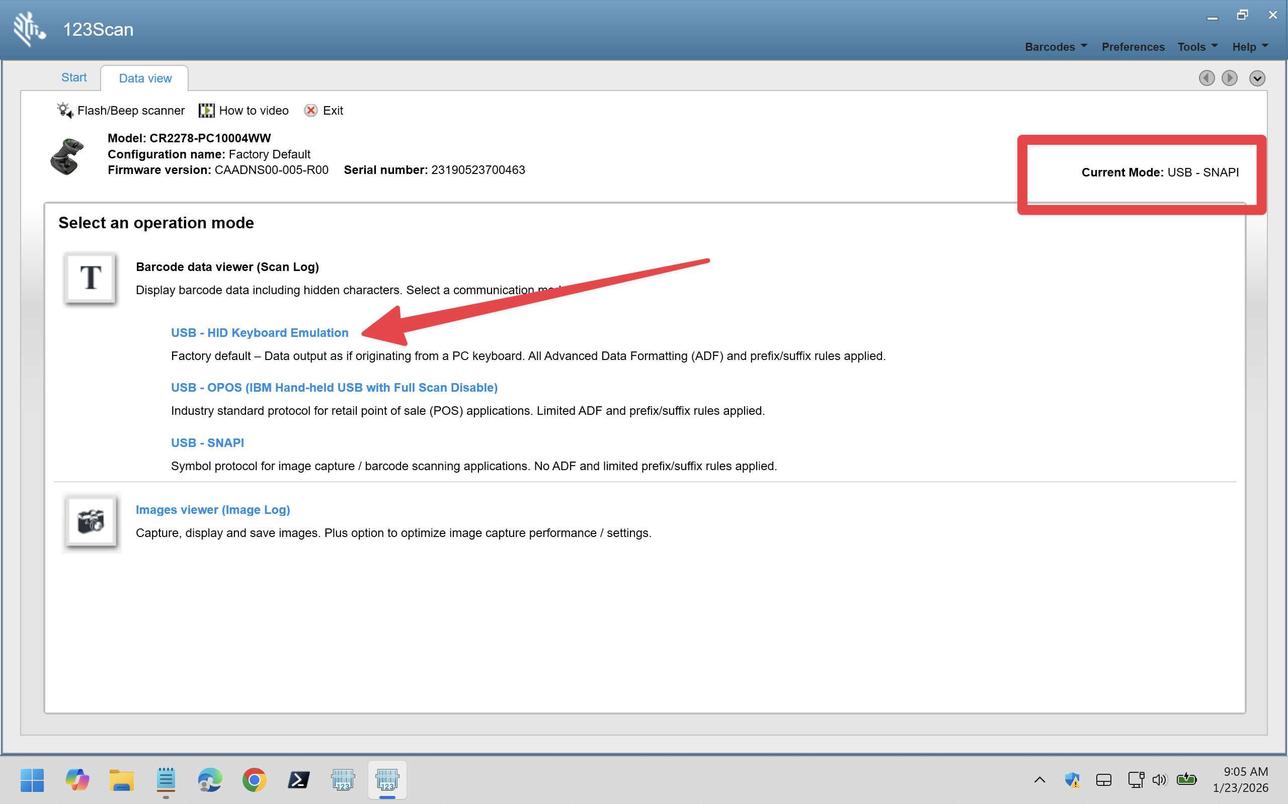 - On the configuration screen for your scanner, check the "Current Mode" in the top right of the screen. It should show "USB - HID Keyboard Emulation". If it does not, your scanner isn't configured correctly.