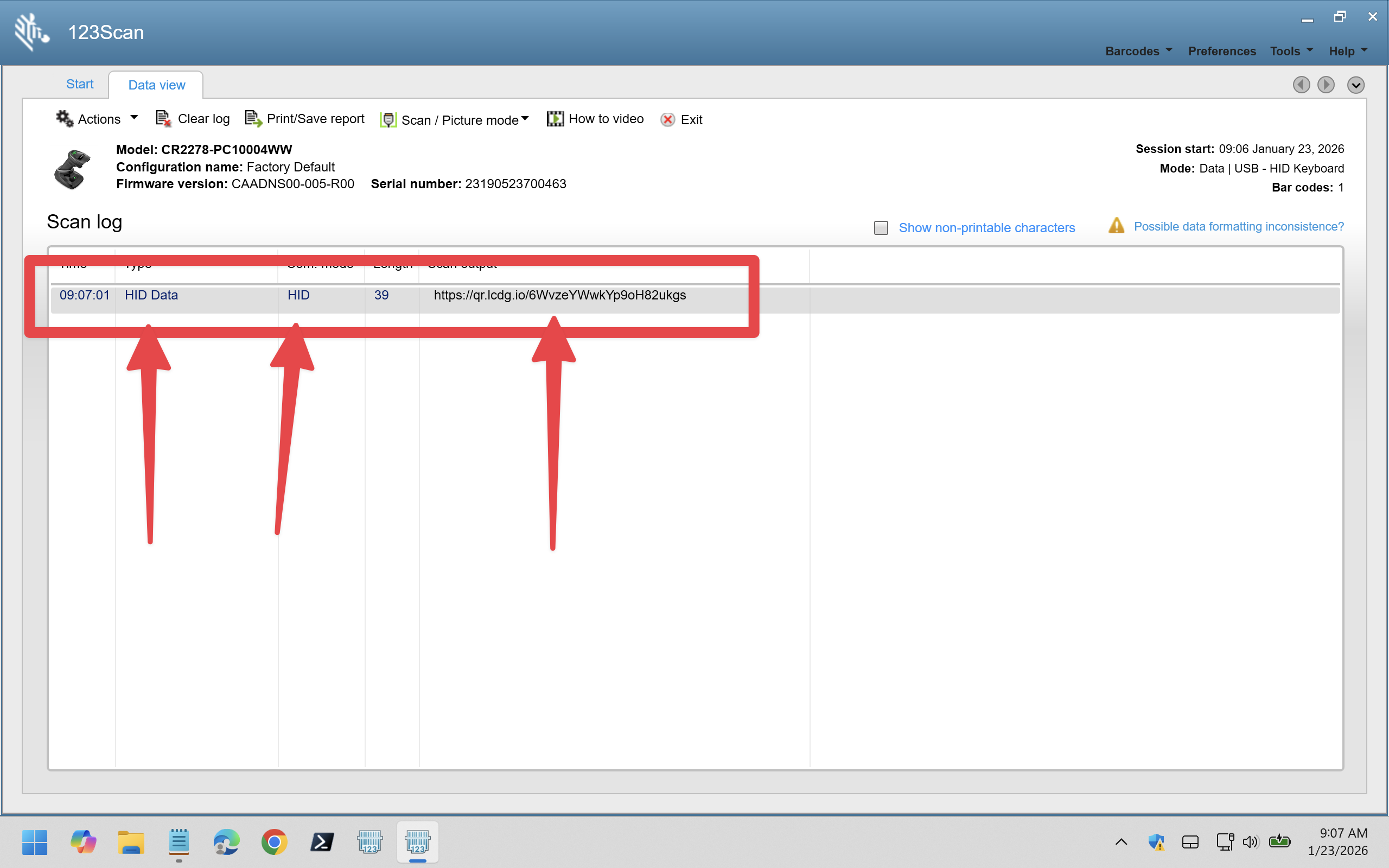 - With your scanner connected via USB to your Windows computer, open Zebra 123Scan, and click on the "Data View" tab.