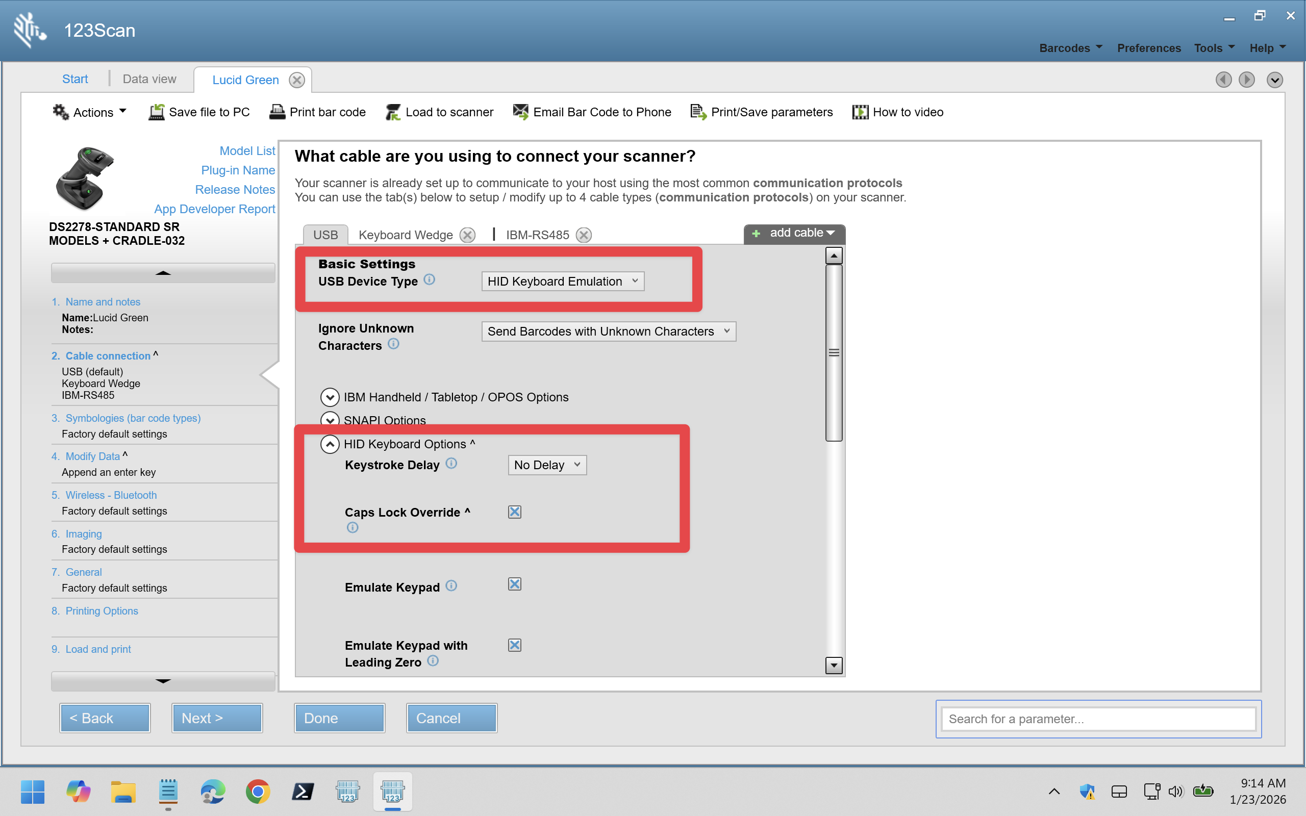 On the Cable Connection step, make sure the USB Device Type is set to "HID Keyboard Emulation" and under the "HID Keyboard Options" section, make sure that the "Caps Lock Override" option is selected.