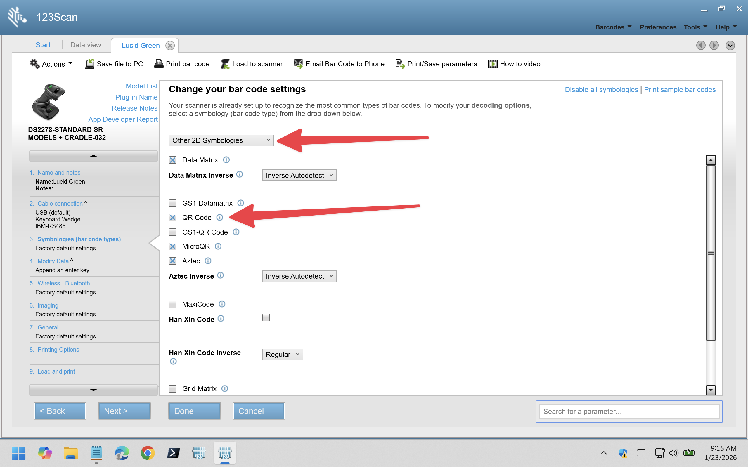 On the Symbologies step, select "Other 2D Symbologies" in the menu and make sure the QR Code option is selected.